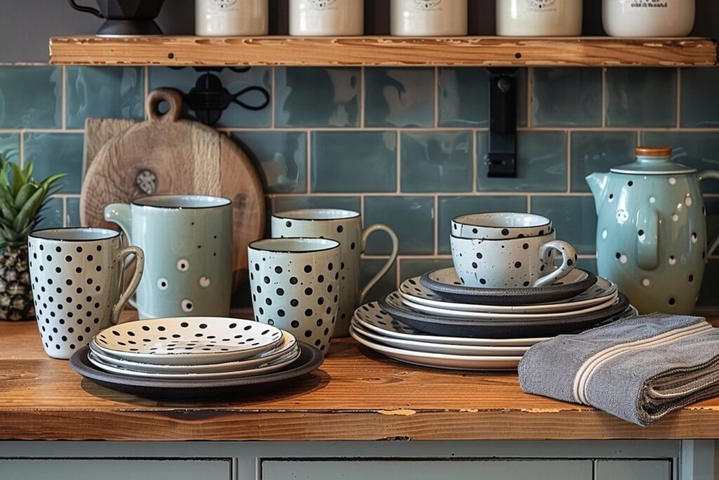 - Textiles de cuisine à pois : optez pour des torchons, nappes, sets de table et même maniques aux motifs à pois, qui donneront du caractère à votre cuisine tout en restant fonctionnels.